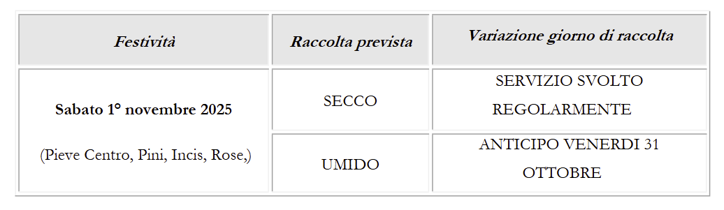 Si avvisano i cittadini che per la festività di Ognissanti, che cade il 1° novembre, sono programmate alcune minime variazioni al servizio di raccolta differenziata nei quartieri Pieve Centro, Incis, Pini, Coppi. In particolare, mentre la raccolta del secco avverrà regolarmente, quella dell'umido verrà anticipata a venerdì 31 ottobre.