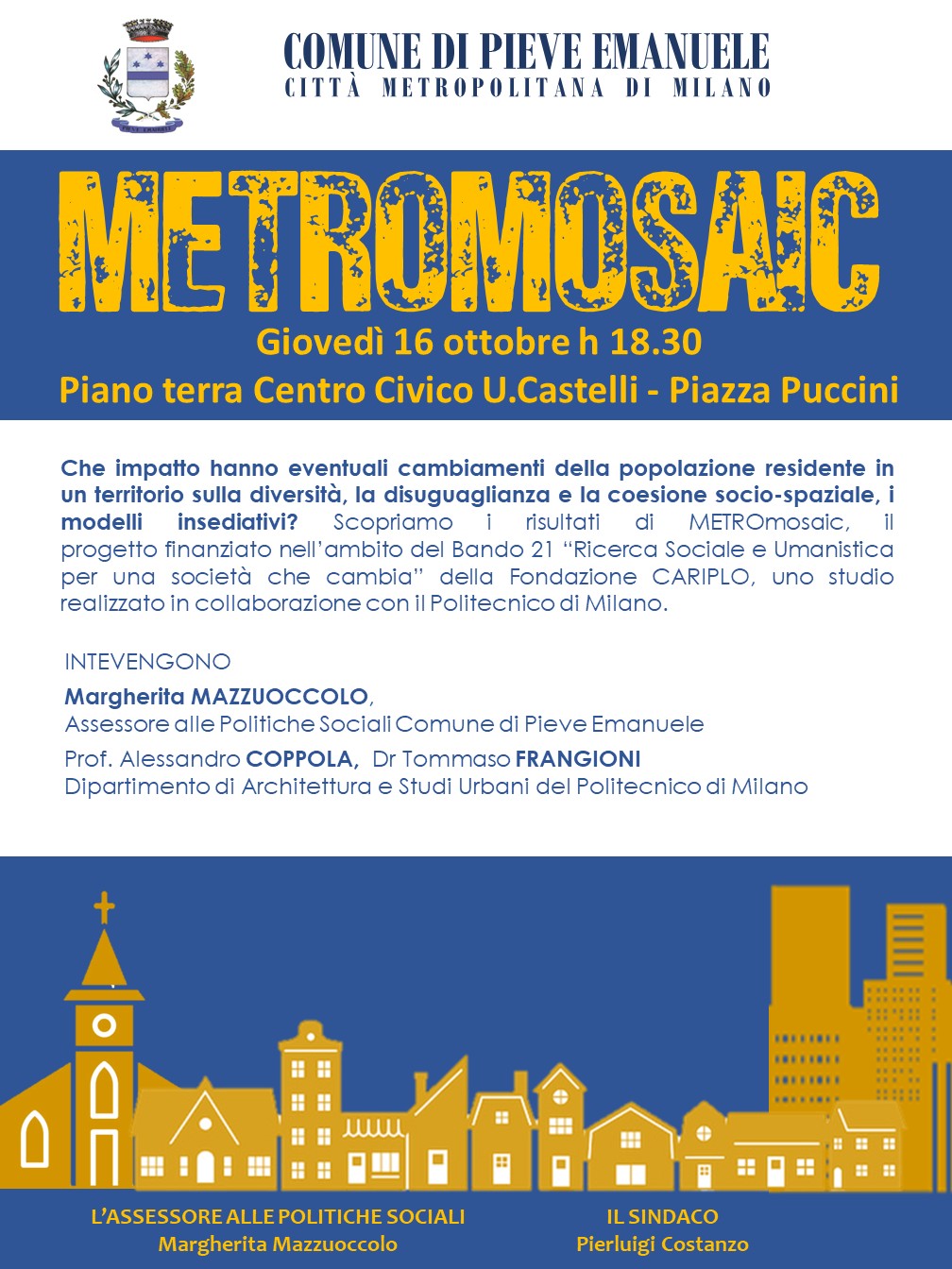 Il Comune di Pieve Emanuele, in collaborazione con il Dipartimento di Architettura e Studi Urbani del Politecnico di Milano, invita la cittadinanza all’evento pubblico METROMOSAIC, in programma giovedì 16 ottobre alle ore 18:30 presso il Centro Civico U. Castelli – Piazza Puccini, piano terra.